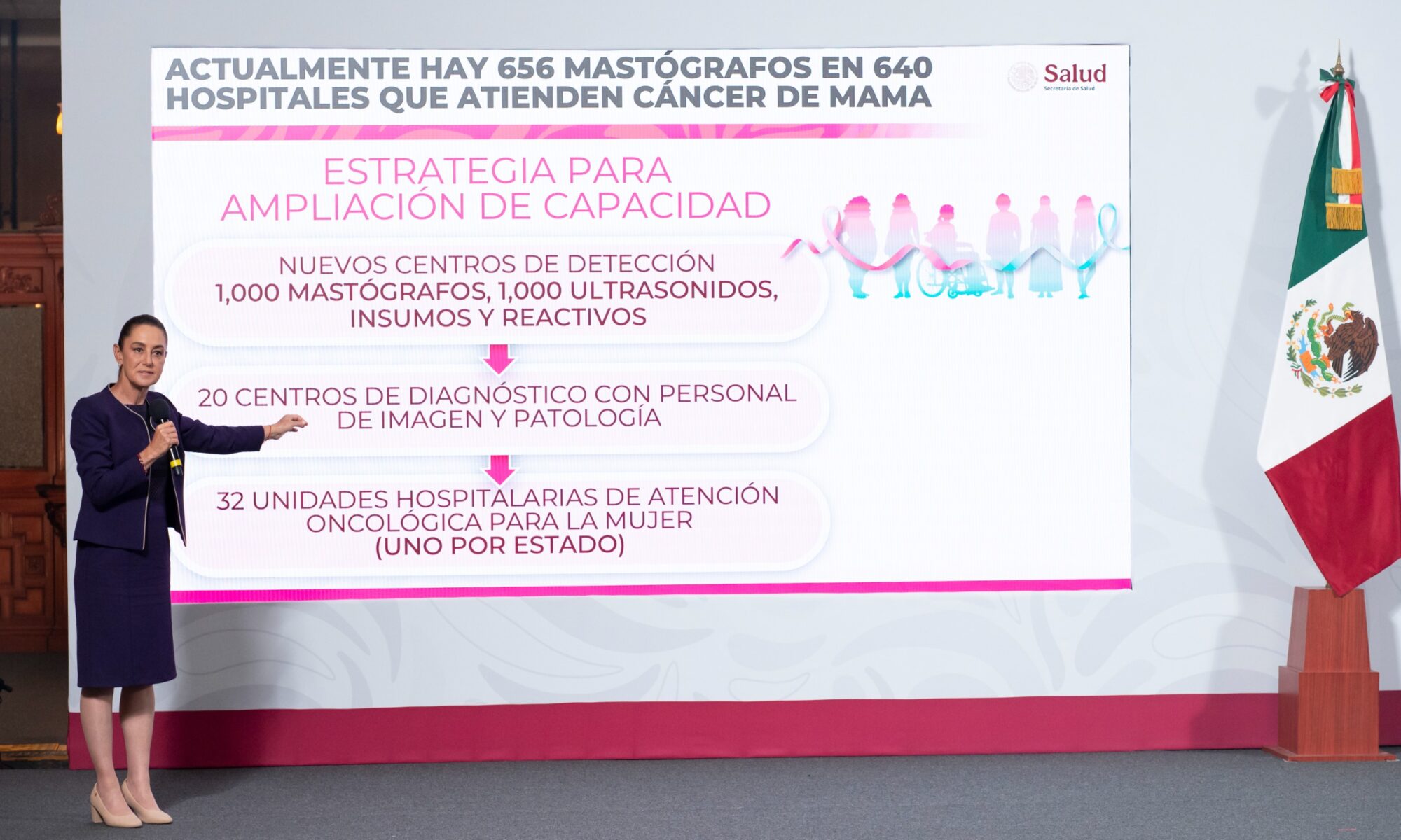 La presidenta Claudia Sheinbaum presentó este 21 de octubre el Modelo de Atención Universal de Cáncer de Mama para agilizar la detección y atención de esta enfermedad, para lo cual anunció la compra de 1,000 mastógrafos y 1,000 ultrasonidos, que se suman a los 656 que están en operación en el sistema público de salud de todo el país.