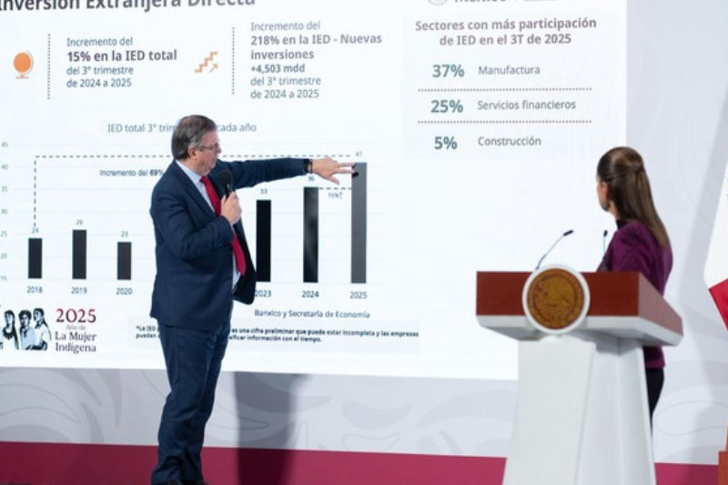 El secretario de Economía, Marcelo Ebrard Casaubon, detalló que el mayor crecimiento en la IED se observa en nuevas inversiones, pasando de 2 mil millones de dólares a 6 mil 500 millones de dólares, que beneficiarán a sectores como energía, centros de datos, obras de infraestructura y sector financiero y cuyo origen en su mayoría proviene de Estados Unidos, España, Países Bajos, Japón y Canadá. Agregó que la IED registra un incremento de 69 por ciento de 2018 a 2025.