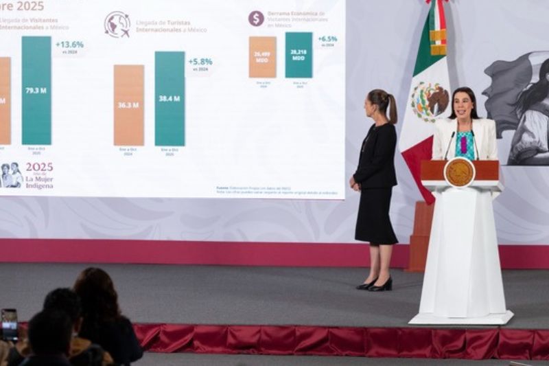 Agregó que, en este mismo periodo, los pasajeros en vuelos regulares nacionales también incrementaron en 3.2 por ciento, respecto al 2024, al pasar de 50.81 millones a 52.43 millones; en el caso de vuelos regulares internacionales de 47.34 millones a 47.98 millones, destacando el incremento en la llegada de turistas de Italia, Corea del Sur, Canadá, Argentina, China y Estados Unidos. Además, creció 181 por ciento el porcentaje de pasajeros internacionales del Tren Maya, ya que ha transportado más de 75 mil personas de otros países. En el caso de visitantes a museos, este indicador incrementó 17.3 por ciento; en las zonas arqueológicas 2.1 por ciento y como reflejo de que en México es Tiempo de Mujeres, han llegado 8.5 millones de mujeres al país.