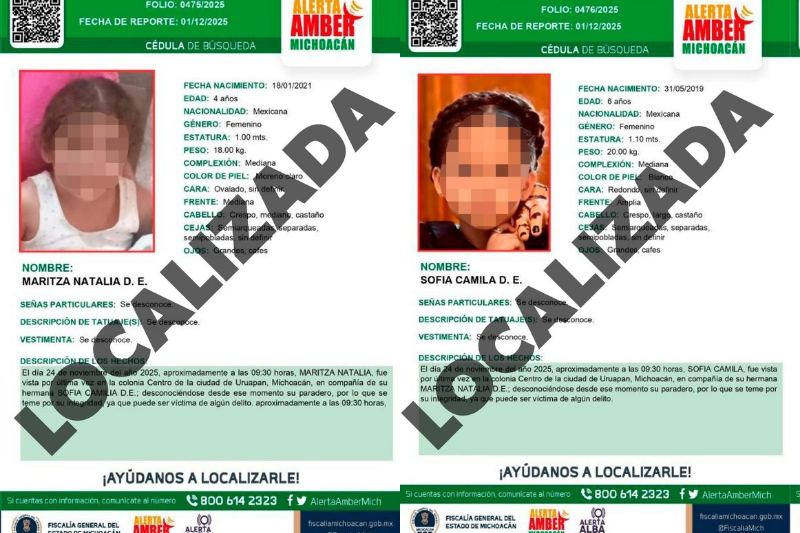 Morelia, Michoacán, 11 de diciembre del 2025.- Como resultado de una acción operativa conjunta entre la Secretaría de Seguridad Pública (SSP) y las fiscalías de Michoacán y Nuevo León, fueron localizadas con vida las niñas Maritza Natalia D. y Sofía Camila D., y se detuvo a Luis Felipe “N”, presunto responsable del delito de secuestro cometido en agravio de las menores y de Maritza Natalia E., quien fue localizada sin vida el pasado 29 de noviembre en Uruapan.