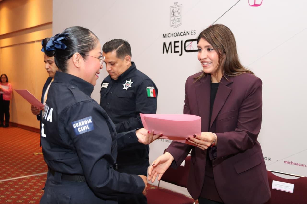 Morelia, Michoacán, 16 de diciembre de 2025.— La secretaria de Igualdad Sustantiva y Desarrollo de las Mujeres Michoacanas, Alejandra Anguiano González, en coordinación con el secretario de Seguridad Pública, José Antonio Cruz Medina y la Policía Auxiliar, realizó la clausura del Curso Especializado en Materia de Primer Respondiente con Perspectiva de Género, en donde participaron 2 mil 134 personas servidoras públicas.