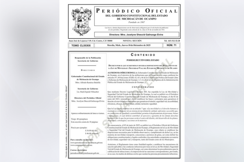Morelia, Michoacán, 19 de diciembre de 2025.- El secretario de Gobierno, Raúl Zepeda Villaseñor, informó la publicación en el Periódico Oficial del Estado del decreto que reforma el Reglamento de la Ley de Movilidad y Seguridad Vial y elimina las multas e infracciones económicas de tránsito en Michoacán.