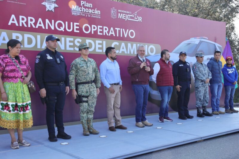 Zacán, Michoacán, 9 de enero de 2025.- Para reforzar la seguridad en el tramo carretero Uruapan-Peribán, el gobernador Alfredo Ramírez Bedolla en la comunidad con autogobierno de Zacán, puso en marcha el operativo Guardianes del Camino, integrado por Guardia Civil, Ejército Mexicano y Guardia Nacional.