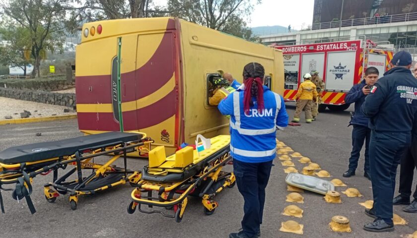 Morelia, Michoacán, 20 de enero de 2026.- El Centro Regulador de Urgencias Médicas (CRUM), de la Secretaría de Salud de Michoacán (SSM), desplegó un operativo de atención para asistir a las personas lesionadas tras la volcadura de un camión de pasajeros registrada este martes en la glorieta de Tres Marías, en la ciudad de Morelia.