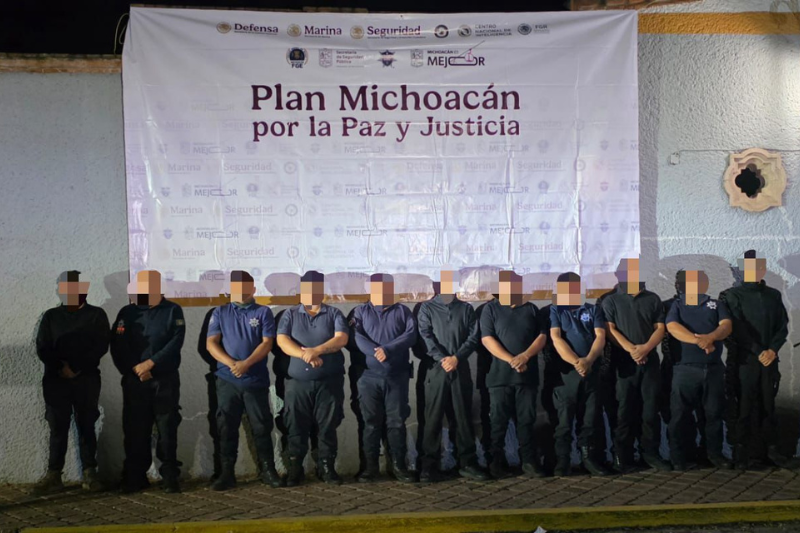 Ecuandureo, Michoacán, 24 de febrero del 2026.- Elementos de la Secretaría de Seguridad Pública (SSP) detuvieron a 11 policías del municipio de Ecuandureo, entre los que se encuentra el director de Seguridad Pública Municipal, por estar presuntamente relacionados con actividades ilícitas y posesión de drogas.