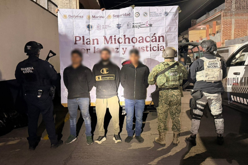 Jiquilpan, Michoacán, 24 de febrero del 2026.- Como resultado de un operativo interinstitucional, elementos de las secretarías de Seguridad Pública (SSP), de la Defensa Nacional (Defensa) y Guardia Nacional (GN) detuvieron a tres hombres en posesión de tres armas de fuego, más de 200 cartuchos útiles y 32 dosis de hierba verde, al parecer mariguana.
