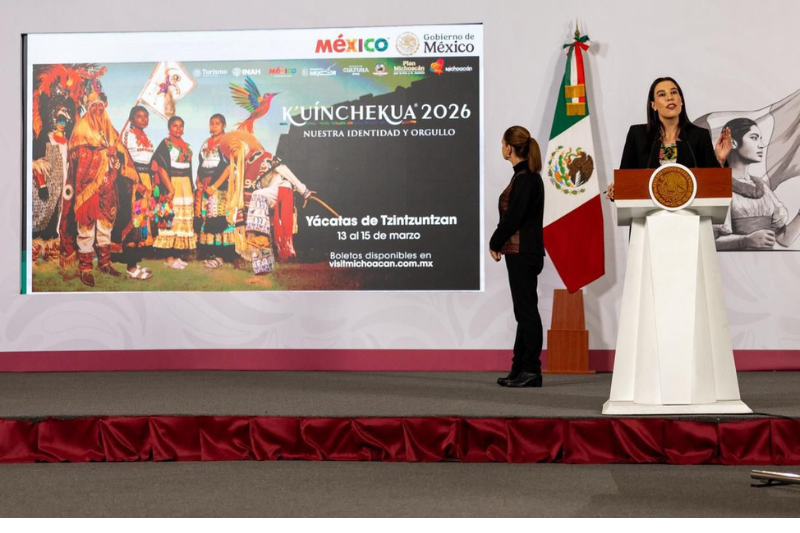 Ciudad de México, 26 de febrero de 2026.- Con el respaldo de la presidenta de México, Claudia Sheinbaum Pardo, este día se presentó a nivel nacional la edición 2026 de la K’uínchekua, encuentro donde las portadoras y portadores de las tradiciones mostrarán la riqueza de Michoacán, del 13 al 15 de marzo en las Yácatas de Tzintzuntzan.