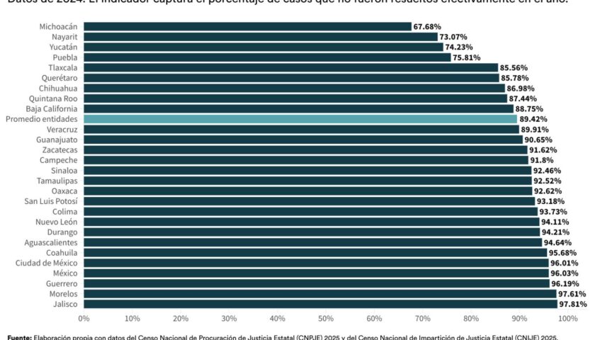 En contraste, el reporte señala niveles críticos de impunidad en otras entidades, como es el caso de Jalisco, con un 97.81 por ciento; Morelos, con un 97.61 por ciento; y Guerrero, con un 96.19 por ciento.