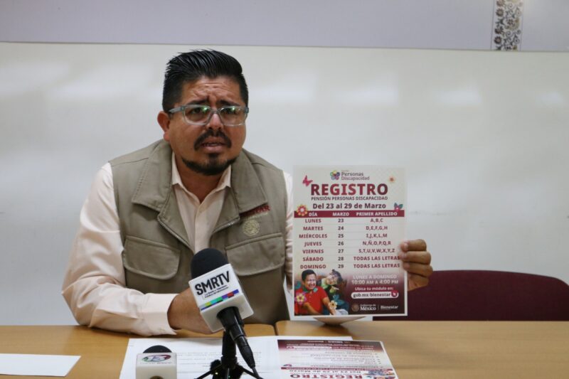 El delegado de Bienestar en Michoacán, Roberto Pantoja Arzola, informó que, del 23 al 29 de marzo, se realiza el registro a la Pensión para el Bienestar de las Personas con Discapacidad derecho que consagra el artículo 4° de la Constitución mexicana y otorga 3 mil 300 pesos bimestrales de manera directa y sin intermediarios a través de la Tarjeta Bienestar.