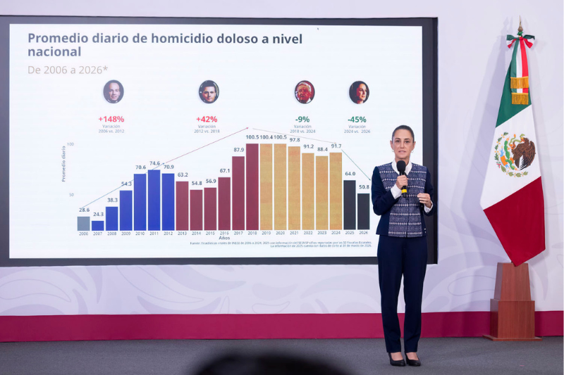 “En nuestro gobierno, con cifras preliminares a 2026, hemos reducido los homicidios dolosos del 2024, 91.7 al 2026 en 50.8 diarios, una reducción del 45 por ciento. Es decir, seguimos trabajando y hay que trabajar más, pero la Estrategia está dando resultados”, puntualizó en la conferencia matutina: “Las mañaneras del pueblo”.
