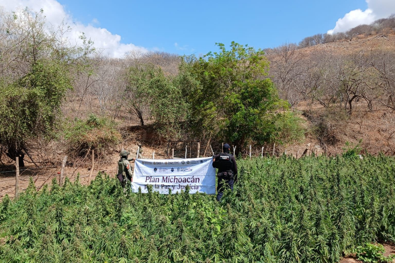 Huetamo, Michoacán, 21 de abril de 2026.- Resultado de una acción estratégica dentro del Plan Michoacán por la Paz y la Justicia, elementos de las secretarías de Seguridad Pública (SSP) y de la Defensa Nacional (Defensa) localizaron e incineraron un sembradío con más de 12 mil 600 plantas de mariguana.