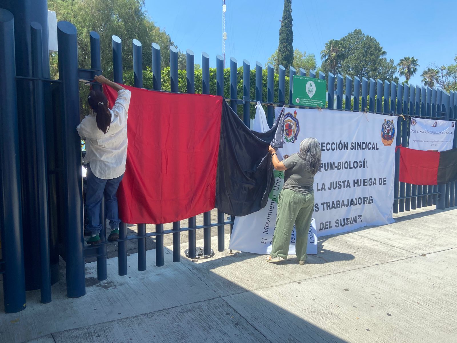Los suemistas liberaron las puertas y movieron sus banderas rojinegras a los costados, pues la huelga continuará, ahora a puertas abiertas, en tanto se espera un resolución a los recursos de apelación interpuestos por el SUEUM.