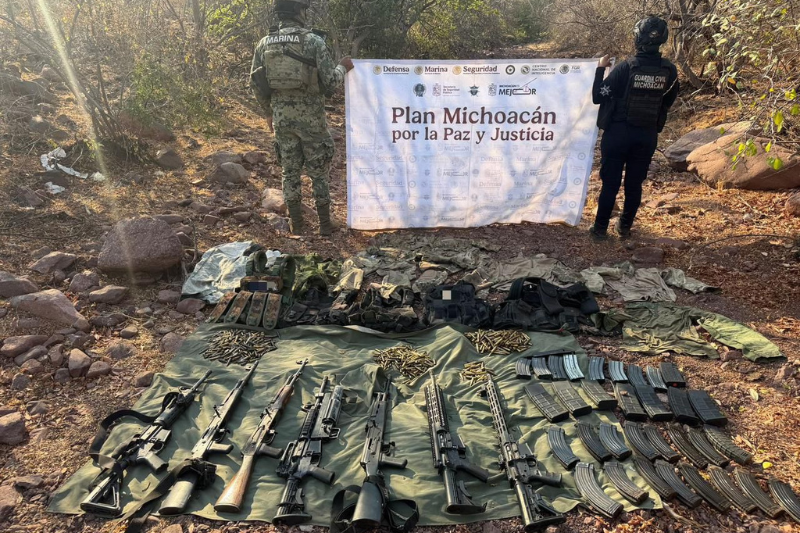 La Huacana, Michoacán, 3 de marzo de 2026.- Como parte de las acciones operativas implementadas en el marco del Plan Michoacán por la Paz y la Justicia, elementos de la Secretaría de Seguridad Pública (SSP), en coordinación con la Secretaría de Marina (Marina), aseguraron armamento de alto poder y equipo táctico en este municipio.