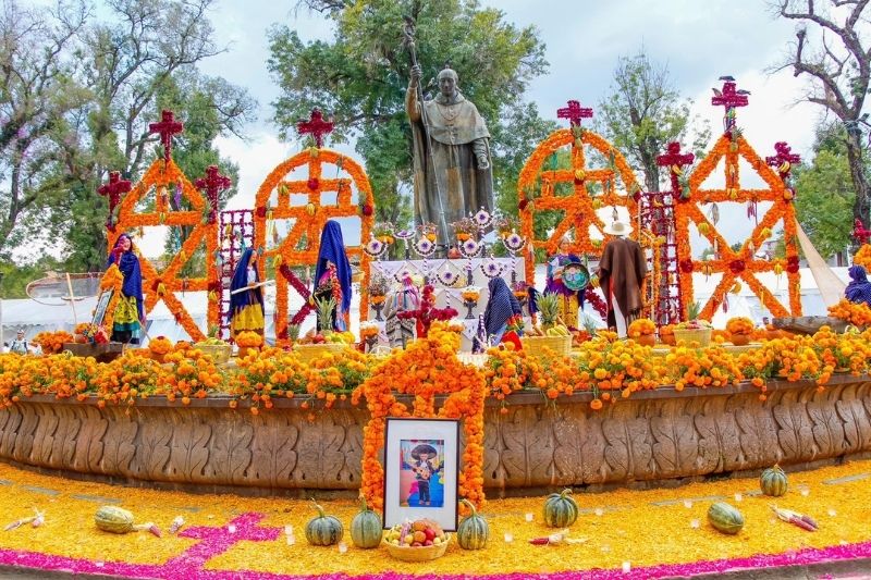 En varias comunidades purépechas, como Tzintzuntzan y Jarácuaro, es tradición colocar un arco de flores en cada altar de muertos. Este arco, hecho con cempasúchil y otras flores, simboliza la puerta que permite a las almas de los difuntos cruzar al mundo de los vivos y unirse a la celebración junto a sus seres queridos.